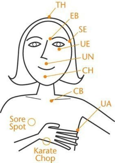 你可以使用任何一只手去做拍打的动作,拍打时,通常要同时使用食指与中指。请轻轻地拍打每个点,不要弄伤了自己。每个点大约拍打七次,多一点或少一点无妨(5或9次都是足够的)。每个拍打点都位在身体的两侧,所以你拍打的点在哪一侧或是交替两侧拍打都是可以的。