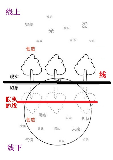 想象这里有一条线,这个就是线上线下的那条线。就好像感觉你站在湖岸,在对岸你看到长了一些树,同时湖面上也看到了树的倒影。你知道岸上的树是真实的,而它的倒影并不是真的。这条岸就是我们说的那条线。事实上线上是实相,线下是幻想;线上是和平、线下是混乱;线上是喜悦、线下是苦难;线上是当下、线下是过去和未来;线上是真我、线下是假我(俗称的小我);线上是丰盛、线下是匮乏;线上是爱、线下是恐惧。
