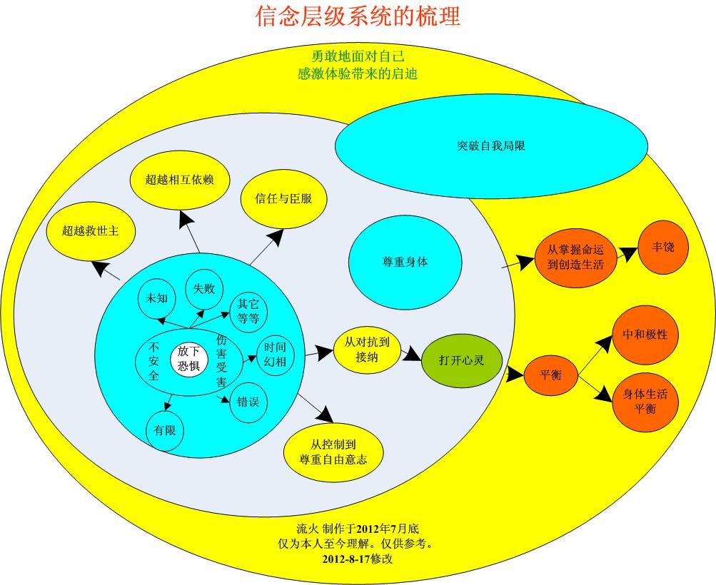 SSOA回顾及信念层级系统的梳理作者:流火 2012-08-15 一直想对SSOA做个回顾。对我而言,她并不是灵修方式,而是全新的认识视角与可行的生活实践。虽然最后,她嘎然而止,但我全心投入翻译并实践的5年时光,帮我洞开了新的认识大门,对我的人生产生了深远而积极的影响。 所以,与其说SSOA回顾,倒不如说我的SSOA时期回顾。其中,甄别出当中的误区,就是我所想做的,因为,不希望有人因为害怕而将其断然抛弃,从而全盘否定了来自大自然王国、祖先王国、地球母亲信息中,所蕴含的智慧与启迪。老祖宗说,不要因噎废食。马克思说,不要倒洗澡水时,把孩子也倒掉了。呵呵。 对我来说,要想清晰地认识SSOA,就要将来自大自然王国、祖先王国与地球母亲来源的信息,与Lilliya及其成员的实践,区分开来对待,并进行对比参考。事实上,关闭SSOA的主因,是因为Lilliya发现了自己有未知的失误,为了防止反过来对大自然王国等产生危害,所以才将其关闭。所以,对SSOA信息源的很多恐惧,是并不必要的。 所以下文中,会用SSOA信息源、SSOA实践,作为区分。 SSOA信息源带来了许多富有启迪的概念,比如放下救世主、内求致因、超越恐惧、超越极性、身体与能量的同步提升等等。 然而,也正是在内求致因时,虽然SSOA认识到了能量模式、思想形态与业力是背后的致因,但这三者的关系,却并没有得到过真正厘清。也许在Lilliya的灵视体验中,这些是同步出现、同步清理消失的,所以这三者在SSOA的最初实践中常常作为打包,一并处理。 但SSOA信息源中,对时间幻相一直有一种紧迫感,这也许是Lilliya本人及成员群体的核心恐惧之一。所以,伴随着这种紧张感所带来的对速度的追求,造成了SSOA实践中不再继续区分前三者的不同,逐渐向能量模式倾斜,以能量作为第一源头,不断追寻一个又一个能量模式,却被带得越来越远,最后偏离了最初的目标。并且,由于过于着急要超越模式,不断拆解模式的过程,逐渐演变成了对非物质一味的对抗和排斥。 另外,SSOA实践的模式,是试错、纠错模式,找到前人的错误而纠错。这本来并没有什么问题,但由于前面的时间幻相的恐惧、错把能量作为第一源头,演变成越来越大的对抗而没有达成真正原谅,导致对前人的失误没有找到最根本的思想来源,所以纠错的任务屡屡失败,进而反而造成对错误及失败越来越大的恐惧。 这些恐惧彼此循环、交叠、扩大,并层层延伸,造成恶性循环,最终造成了SSOA整体实践的失败,实在是可惜可叹! 如果,慢一点下来,也许SSOA和其成员,就有机会能察觉到里面的矛盾和不妥。但忙于赶路,忙于寻找新出现的业力根源,让很多方向的探索都行进到半途,甚至离最终的根源还差一点儿,就慌忙掉头,最终让这一切都被忽略。 然而,这并不是说SSOA信息源一无是处,相反她为普通人提供了很多简单易行的实践方式。比如说意愿,只不过这是单一方向的,而到了LWS的诗歌时,属于复合级意愿而已。 其次,SSOA信息源,提供了很多宝贵的原则,并对于很多问题的思想根源,进行了初步的探索,如光之语,还有光之语的极性、思想形态转化的宝贵经验等。然而源于上述的恐惧,这些思想模式只是东零西散、罗列了出来,而没有继续跟踪背后的线索。但实际上,正如我个人的经验,信念系统也如洋葱一般层层交叠,甚至复合交叉,是一个复杂的信念层级系统,所以同样需要抽丝剥茧,才能找到最根源的那个。这也就是,如果只是处理最表层的单个音调(单个思想形态),就会发现按下葫芦起了瓢,无法解决根本问题的原因所在。 还有就是,积累了大把能量探索的经验。如Datre说,能量是中性的存在,就看怎么用。 回首看来,指导我突破SSOA的引路人,恰恰是SSOA。因为SSOA的信息源一直在说,真相并不唯一,每个人都有独一无二的真相。当我发现自己在翻译过程中,过度追求忠实原文,并将网站设置为唯SSOA为宗旨,其实质就是误将SSOA的真相置于我自己的真相之上时,我终于意识到,我在实践中自相矛盾了,是我一手否定了自己的真相。 就这样,当慢慢放下SSOA,静心回首自己时,也恰恰因为我没有任何灵通能力,唯有专注到内心的思想,才越来越深入地找到了失误的核心所在——那就是,错把能量当做第一因素。回想起来,这种认识,是我自小对神秘事物好奇心的引申。而当后来阅读到《塞莱斯丁预言》,发现把一切归为能量争夺,解释了很多我所看到却不解的现象时,就以为,能量就是事物的根本面貌。于是就这样,这个观念就打上了烙印,进入了我的脑海深处。 这也是我和许多提升者,都共鸣并吸引到SSOA的探索中,却无法察觉到这个失误的缘故。归根究底,这是由于对未知的恐惧,所以才要依赖某个东西吧。 当然,这也并不是说能量的探索就没有价值。实际上,对能量的认识可以进一步拓展对自身的认识。只要,同步保持对起心动念的觉察,不要被能量带着自己跑,就好了。难怪中国的传统修行,要这么重视修心啊。 殊途同归。 回顾起SSOA的历程,为东方开拓出提升的路径,重新找回我失去的内在引导,这曾是我孜孜不倦、强烈的意愿、信念、承诺与目标。回首看来,尽管我的天赋平平,但这一目标还算基本实现,堪可自慰。当然,这其实也并不算什么,实则是一条身为普通人如何找回/忆起自身引导的阶段性路径之一,但其价值在于,一旦找回/忆起内在引导,后面的道路虽有可能反复,但将无人再可阻挡。我曾有过巨大的