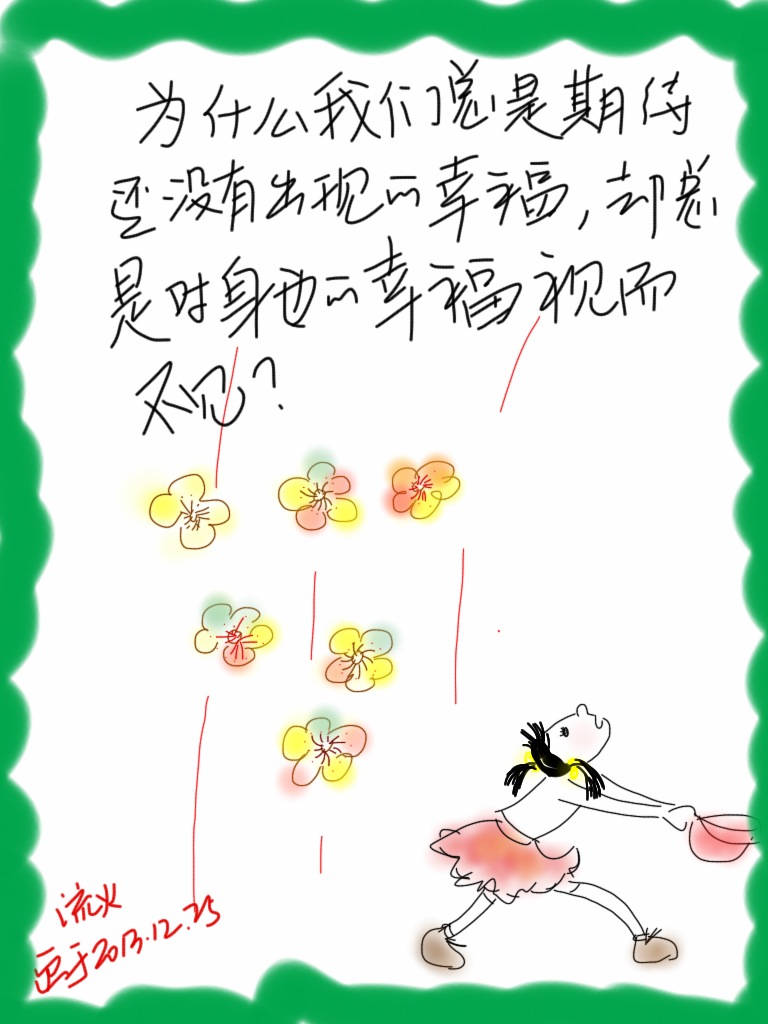 拓展感受幸福的能力作者:流火 2013-12-26 所有的呐喊,都是对爱的呼求。 所有的痛苦,也缘于爱的无法满足与缺失。如何实现对自己的爱,将是成为痛苦而无法自拔的哲学家,还是跨越过炼狱、成为睿智而平和的实现者的分水岭。 真相就是,爱的匮乏本身就是假相,是我们一手制造的假相。 我们并不是没有得到过。只不过,得到的不是我们当下想要的;而想要的,当下还并没有得到。而就是源于这样的阴差阳错、这样的时机错失,我们就产生了爱的匮乏的假相,并由此产生了要去填补匮乏的渴望。于是,我们总是在外界寻求,期待着,有这样一个人或者一份爱存在,ta无时不刻地理解着我们的渴望,关怀着我们的需求,随时给予无微不至的关怀与照料。 当这样的期待屡屡落空时,我们失落,我们愤恨,我们绝望。 可是反过头来想想看,如果我们自己,都还没有做到对自己时刻的理解、时刻的关照、时刻的安慰,我们又如何要对外在提出这个需求呢? 与其说,苦苦期待外界的回应,何不如,让自己学习关怀自己,照料自己呢?那岂不是最简单、最直接、最省事、也最有效率的途径? 就试着将注意力的重心,从对自己的要求之上,转到对自己需求的关怀之上吧。 我,就是自己的慈悲之眼。 觉察与放下自己对爱的限制,拓展自己感受幸福的能力。 如果说,生活中并不缺乏美,缺乏的只是发现美的眼睛。那么也许,生活中并不缺乏幸福,只是我们缺乏了感知幸福的能力。 这就是新的一年我带给大家、也带给自己的祝福,愿回归自己感受幸福的能力。我们可以。