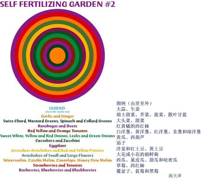 在自我施肥菜园中种植的蔬菜群,应该彼此围绕耕种。每群种子播种的间距应保持在6-10英寸,好留下行走通道以便让你采摘、除草或享受自己所创造的美景。我们制作了一张图,好让你明白植物王国所察觉到最有助于自我施肥的植物群顺序。图中的形状是嵌套圆形,不过如果你愿意的话,也可以按一行行或嵌套的方形栽培。自我施肥的菜园也可以种在高位栽培床中。